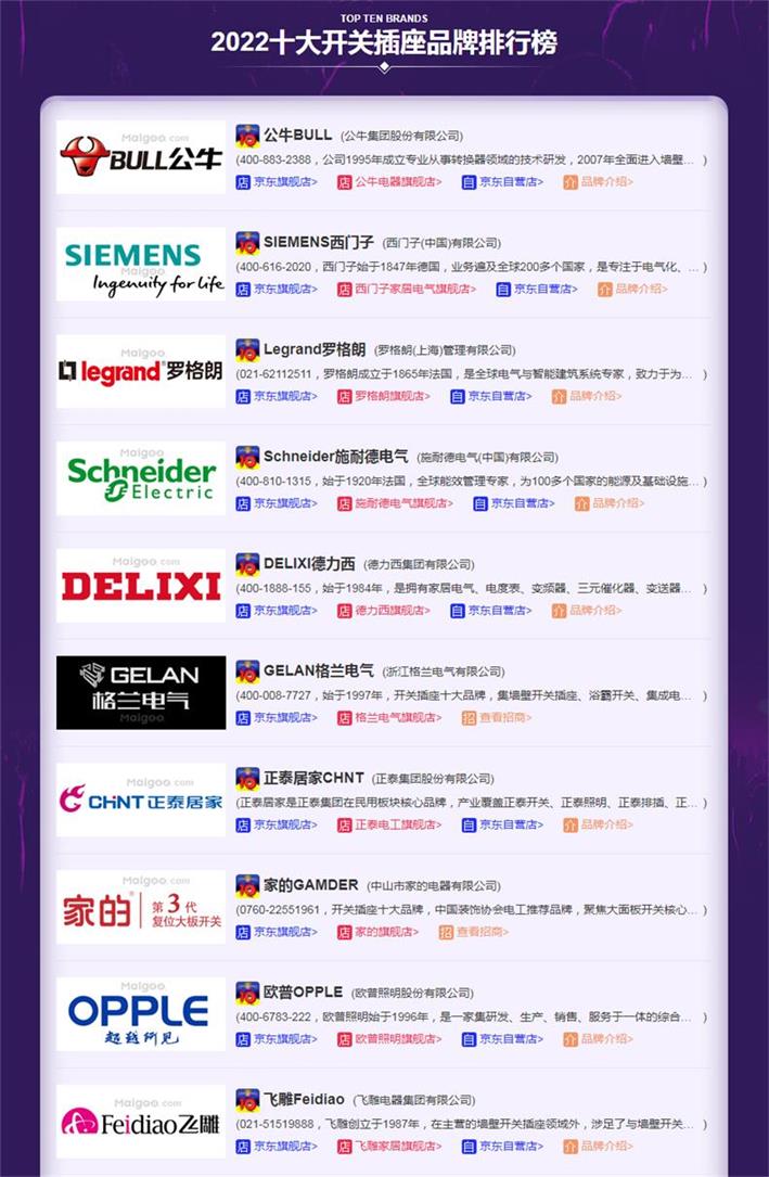 2022年開關插座行業十大品牌:公牛、西門子、羅格朗、施耐德、正泰、德力西、家的、歐普、飛雕、格蘭。(排序不分先后)