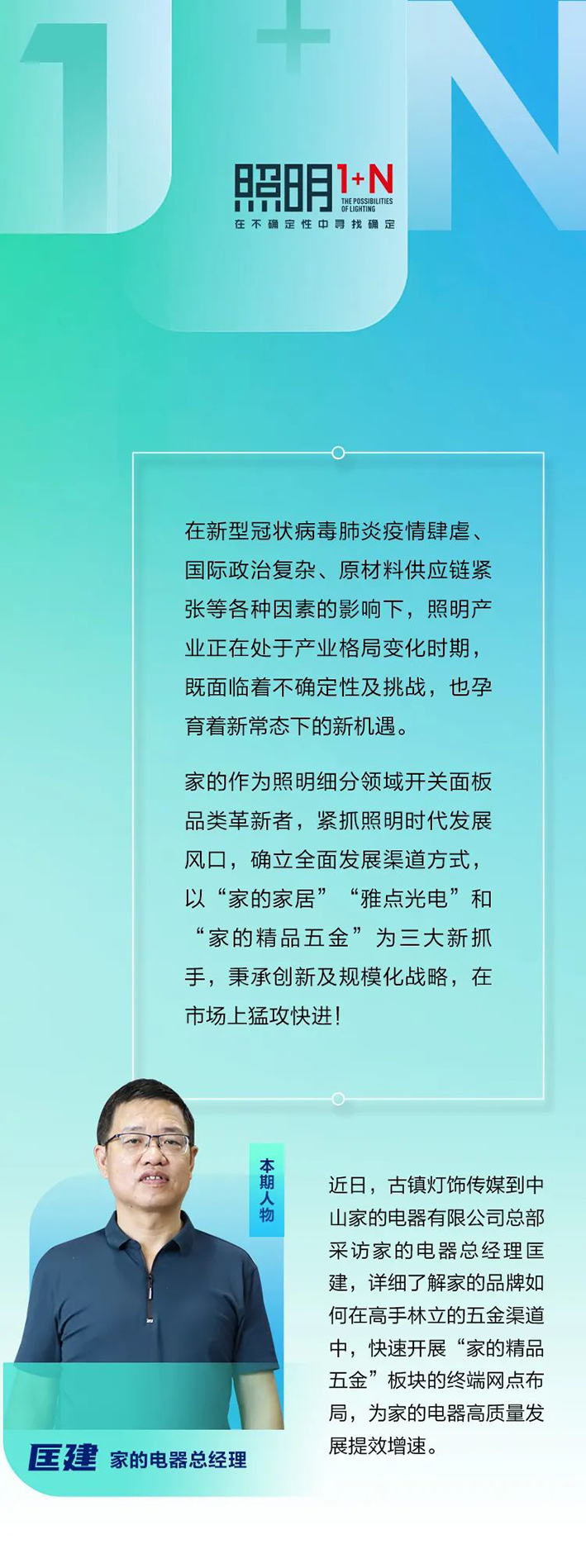 在新型冠狀病毒肺炎疫情的影響,門店、地產(chǎn)、專業(yè)的燈飾渠道等在大量萎縮的沖擊下,企業(yè)需要沉淀并要思考,積極主動,迎難而上。在匡建看來,企業(yè)不能單單只開發(fā)新品,要去發(fā)現(xiàn)新機遇,抓住照明行業(yè)發(fā)展風口,開放自己的思想,投入到時代發(fā)展浪潮、流量的轉(zhuǎn)型中。