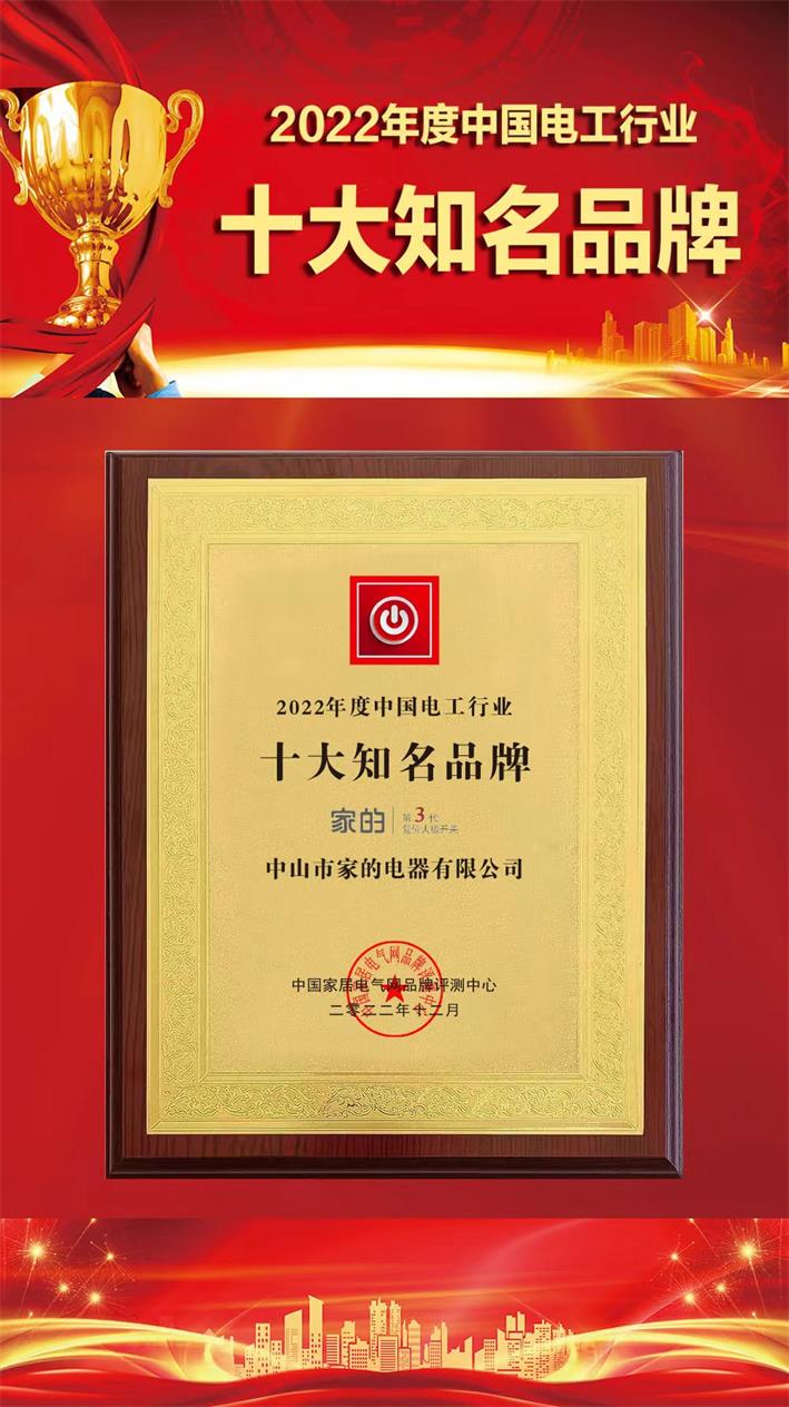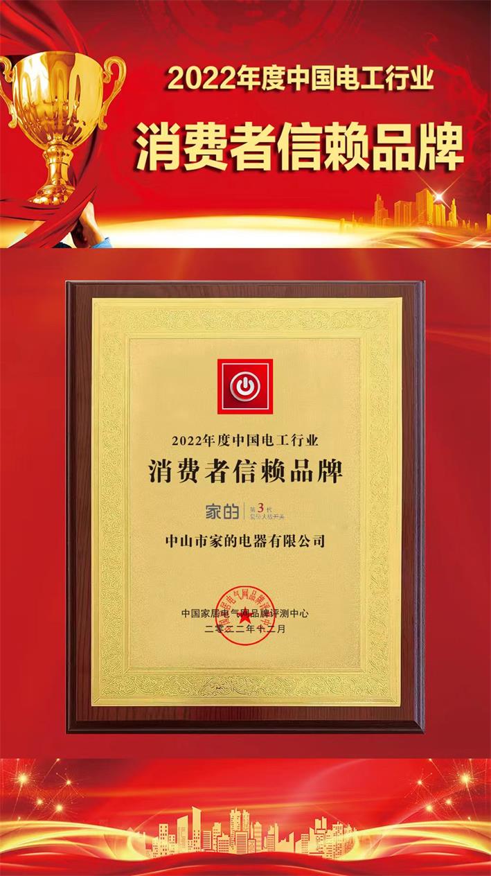 最近,中山市家的電器有限公司(簡稱“家的”)喜提雙獎:2022年度中國電工行業(yè)十大知名品牌、消費者信賴品牌。