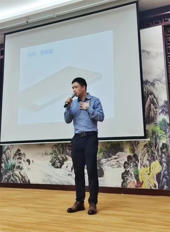 接著,他開始講解本次導(dǎo)購培訓(xùn)會(huì)的課程。他從中山市家的電器有限公司的發(fā)展歷史,研發(fā)、生產(chǎn)、檢測(cè)的實(shí)力,以及家的開關(guān)品牌的知名度、影響力等進(jìn)行了全方位的講解。他重點(diǎn)介紹家的公司現(xiàn)階段主推的核心差異化品類——超級(jí)點(diǎn)。他分析超級(jí)點(diǎn)開關(guān)的競(jìng)爭(zhēng)優(yōu)勢(shì)和賣點(diǎn)等,特別是近期的新品——V20膚感白。他還介紹了家的魔方旋轉(zhuǎn)柜、智能燈箱等獨(dú)特的終端展示方式。
