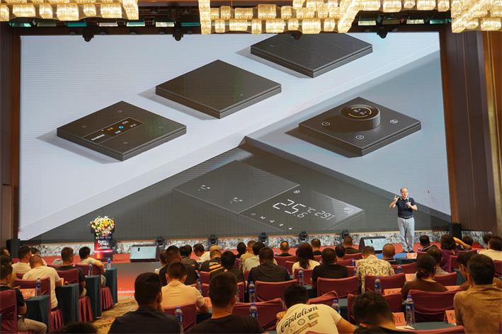 下一個環節,由家的科技銷售負責人謝世鋒發表講話。他講解了智能開關發展現狀、趨勢。他重點提到無線智能開關的有線方案:有線控制負載,無線控制場景。他見解獨到,分析:無線智能也可以做大宅的案例;新品V90系列產品種類齊全,即帶彩屏智能開關、不帶彩屏智能開關、復位機械開關類,迎合人們的實際裝修需求。他還講到家的智能生活館布局,建店幫扶政策等。他的講話內容十分精彩,讓大家受益匪淺。