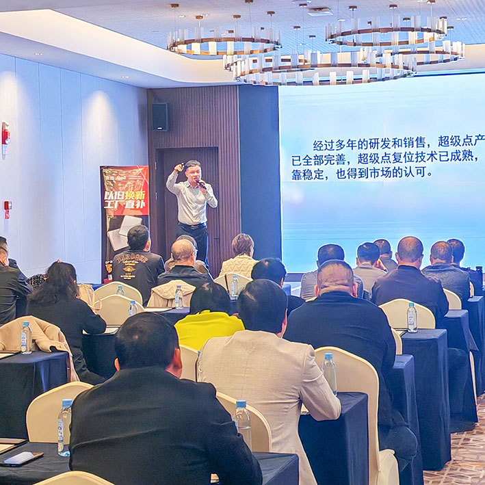 接著,他通過圖片、視頻,在現場詳細地給客戶介紹了“超級點”家族全系產品的各大特點。然后,他重點講解了V12系列以舊換新工廠直補的活動政策,客戶反饋非常熱烈。